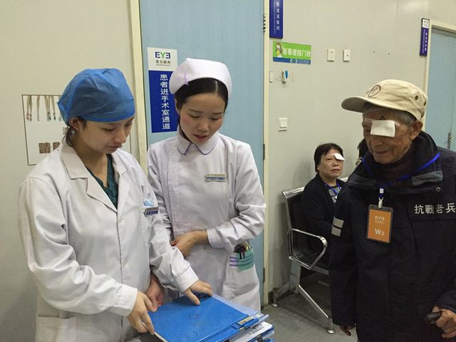 ? ? ? ?10月中旬,關(guān)愛抗戰(zhàn)老兵組織在湖北的志愿者聯(lián)系到武漢愛爾眼科醫(yī)院,希望可以為抗戰(zhàn)老兵李頌卓進(jìn)行眼部檢查并確定是否可以手術(shù)。醫(yī)院了解到李頌卓老人的情況后,派專車將老人接至醫(yī)院,并全程安排工作人員為其開辟綠色通道進(jìn)行檢查。經(jīng)檢查,李頌卓右眼視力0.4,左眼視力為0.2,白內(nèi)障已經(jīng)影響到老人的正常生活,因此需要馬上實(shí)施白內(nèi)障手術(shù)。