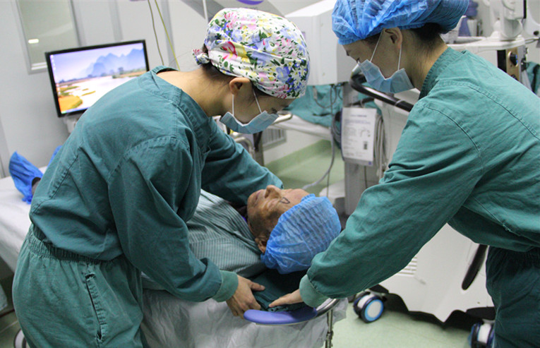 ? ? ? ?10月29日上午10點(diǎn),李頌卓老人被推進(jìn)了手術(shù)室,換手術(shù)服、消毒、上手術(shù)床、眼部麻醉、實(shí)施手術(shù)、手術(shù)完成、再將老人從手術(shù)床扶起、送出手術(shù)室,整個(gè)過程僅十幾分鐘。“手術(shù)非常成功,您可以放心照顧老伴啦!”為李頌卓老人實(shí)施手術(shù)的白內(nèi)障科主任王勇博士笑著說。